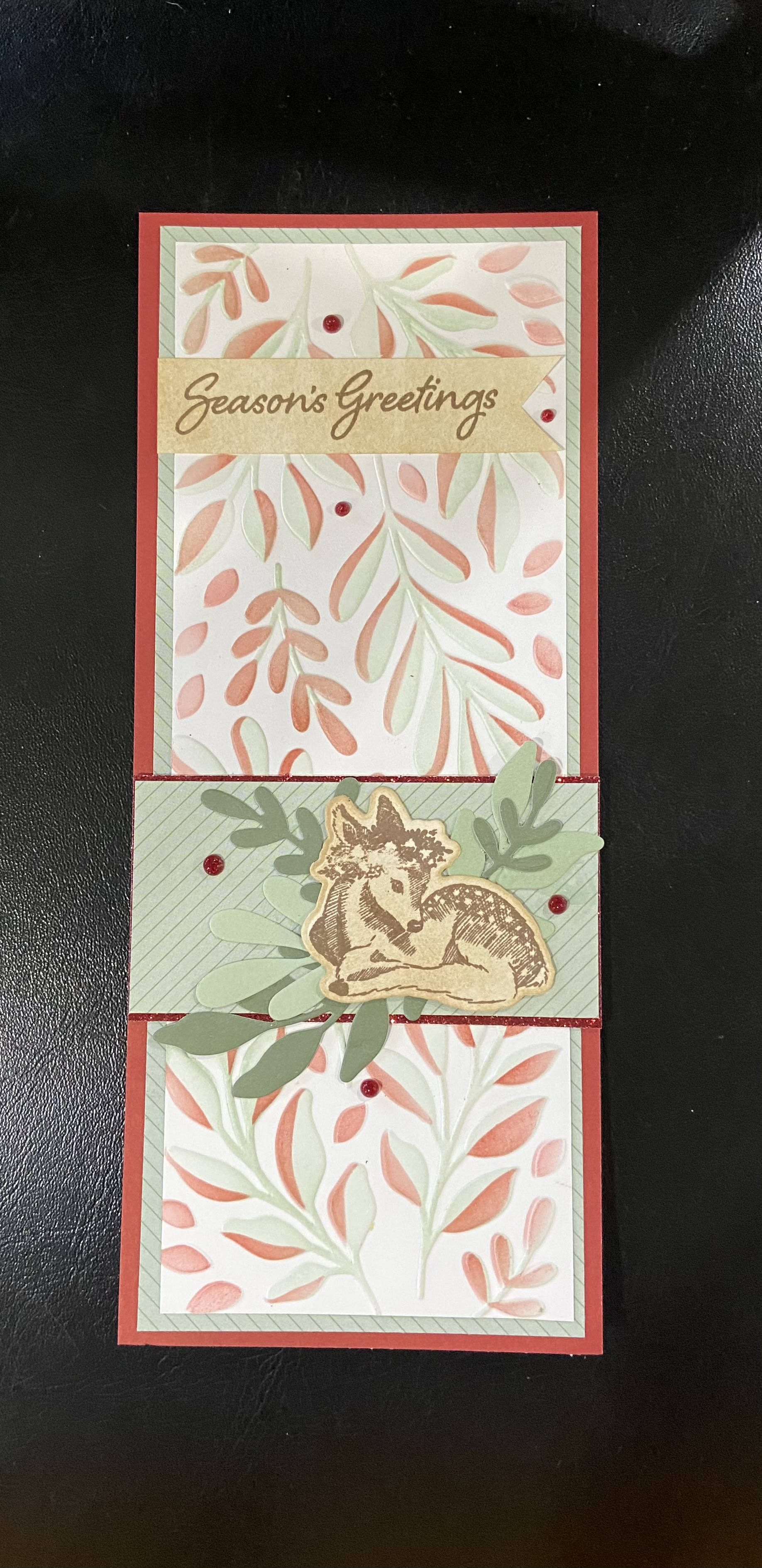 For the bottom, I glued strips of 1/2 inch pieces of paper on acetate paper. I spaced them slightly so they would show a space. I cut the paper to the appropriate size for the card. When placed over a solid paper, it looks like you glued the strips on the paper. Easy Peasy!!!